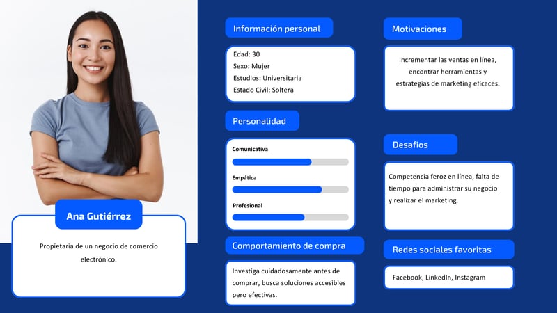 3. Crea un perfil: Crea un perfil completo para cada Buyer Persona. Incluye información demográfica, comportamientos, objetivos, desafíos, motivaciones y preferencias.